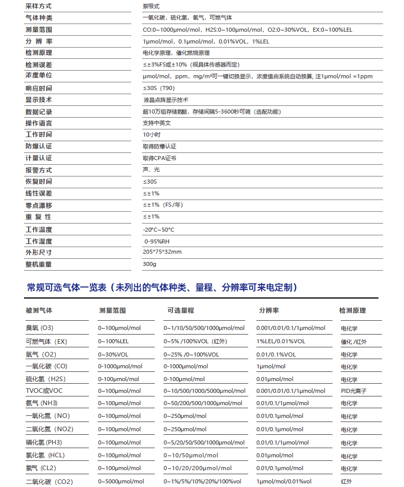 選配:可檢測(cè)任意4種氣體濃度和溫濕度