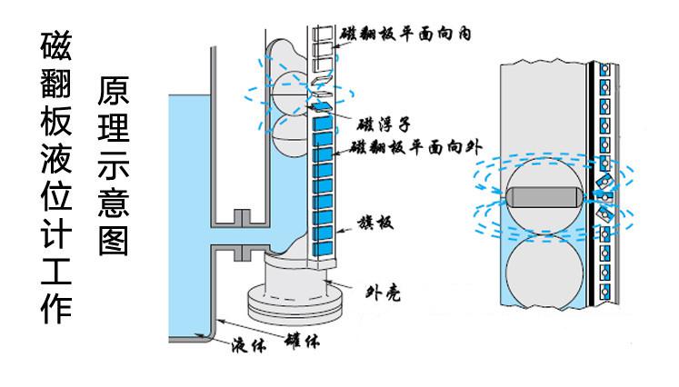 液位計根據(jù)浮力原理和磁性耦合作用原理工作的。當(dāng)被測容器中的液位升降時,液位計主導(dǎo)管中的浮子也隨之升降,浮子內(nèi)的永久磁鋼通過磁耦合傳遞到現(xiàn)場指示器,驅(qū)動紅、白翻柱翻轉(zhuǎn)180°,當(dāng)液位上升時,翻柱由白色轉(zhuǎn)為紅色,當(dāng)液位下降時,翻柱由紅色轉(zhuǎn)為白色,指示器的紅、白界位處為容器內(nèi)介質(zhì)液位的實際高度,從而實現(xiàn)液位的指示。加裝限位開關(guān)實現(xiàn)液位報警與控制。加裝液位變送器實現(xiàn)標(biāo)準(zhǔn)信號輸出供顯示與控制。