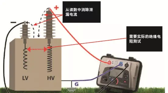 上圖:使用屏蔽接口在沒有高壓和低壓繞組之間的泄漏電流的影響之下,對高壓繞組進(jìn)行測試。