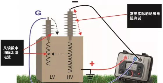 上圖:在變壓器繞組測試中,通常使用屏蔽接口來消除由于臟的磁絕緣子的表面通路而帶來的泄漏電流。