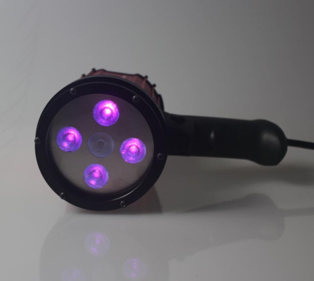 4顆紫外線led,1顆白光led,散光型,透明濾色片,內(nèi)置電池組供電。38cm處紫外線中心強(qiáng)度為4000uw/cm2(適用于航空業(yè))